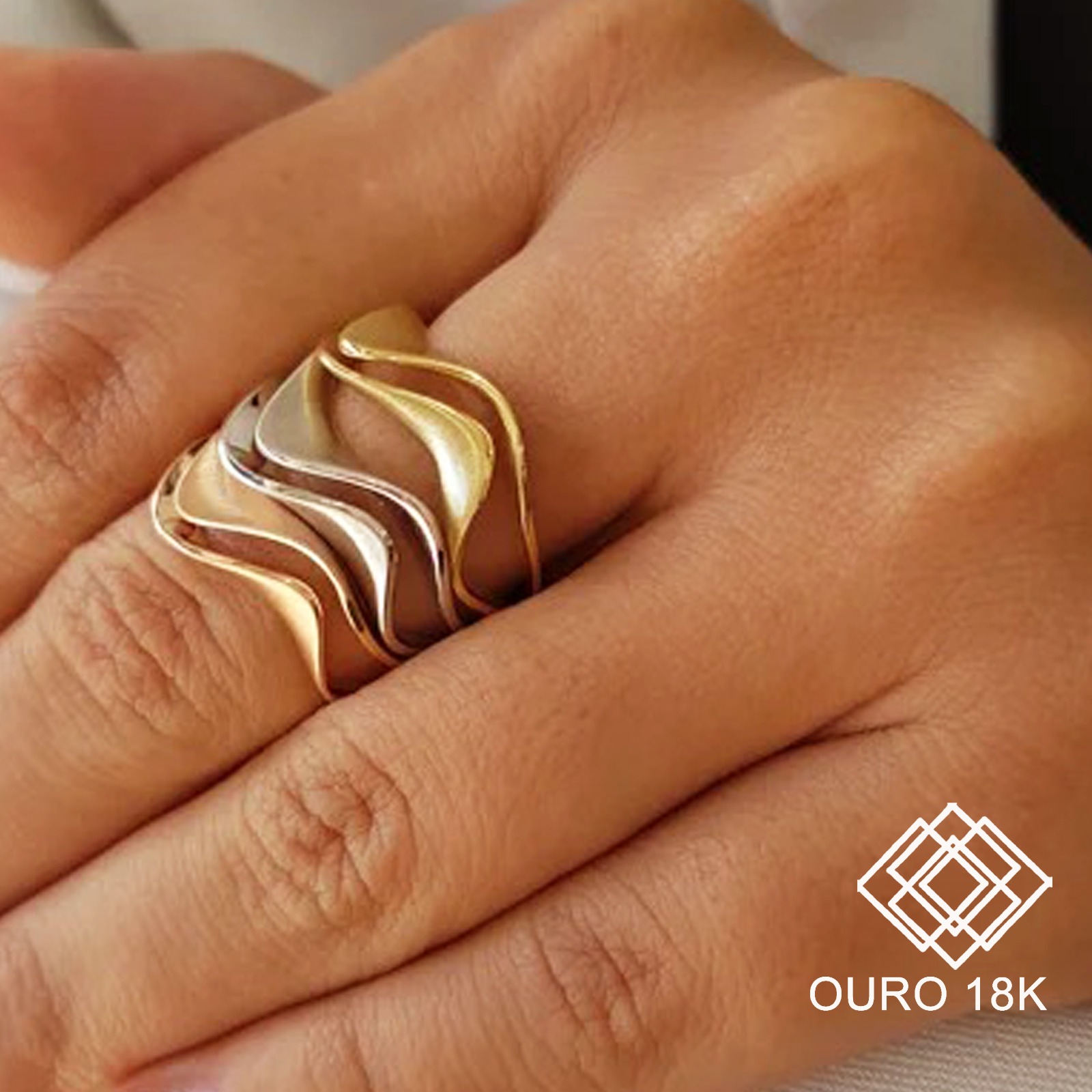 Inspirado na fluidez das ondas, este anel traz um design vazado e moderno, unindo com perfeição as três tonalidades nobres do ouro: amarelo, branco e rosé 18K. Uma joia que representa equilíbrio, elegância e estilo em cada curva.