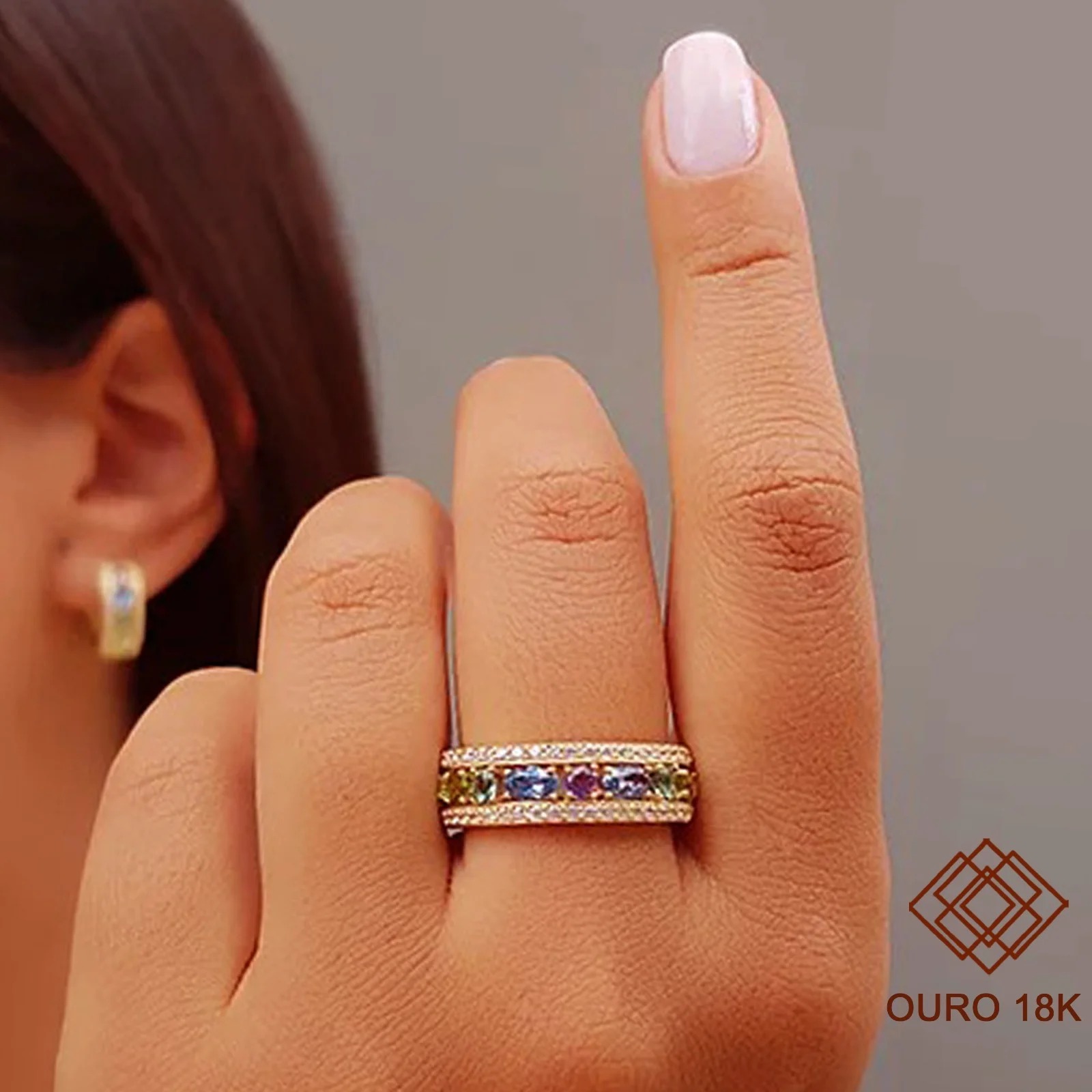 O anel perfeito para quem ama joias clássicas e elegantes. Toda a qualidade do ouro 18k em um design aparador, cravejado com com pedras naturais coloridas e zircônias brancas nas laterias.