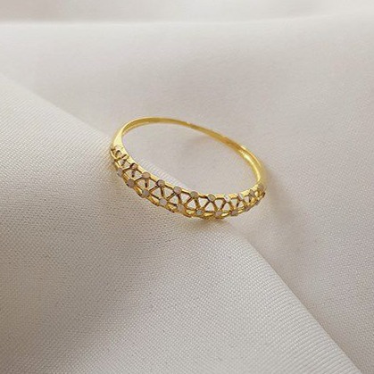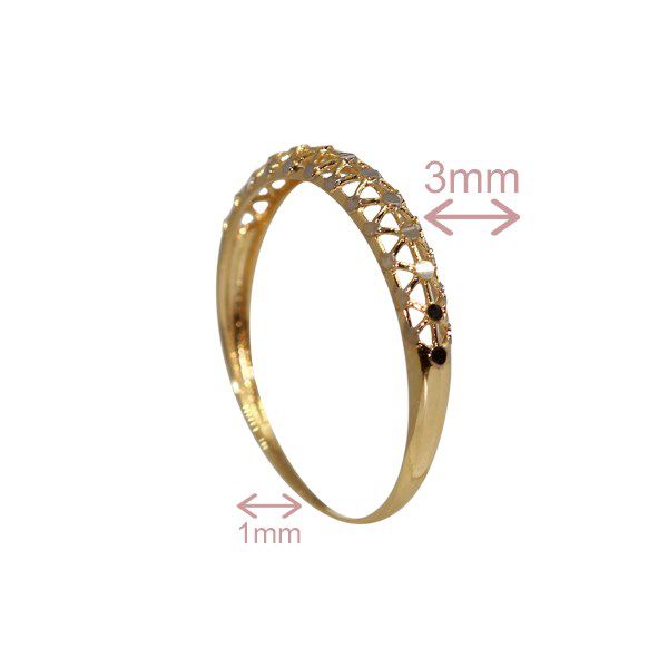 O anel é todo no ouro 18k, não é cravejado com pedras e possui um elegante trabalho vazado.