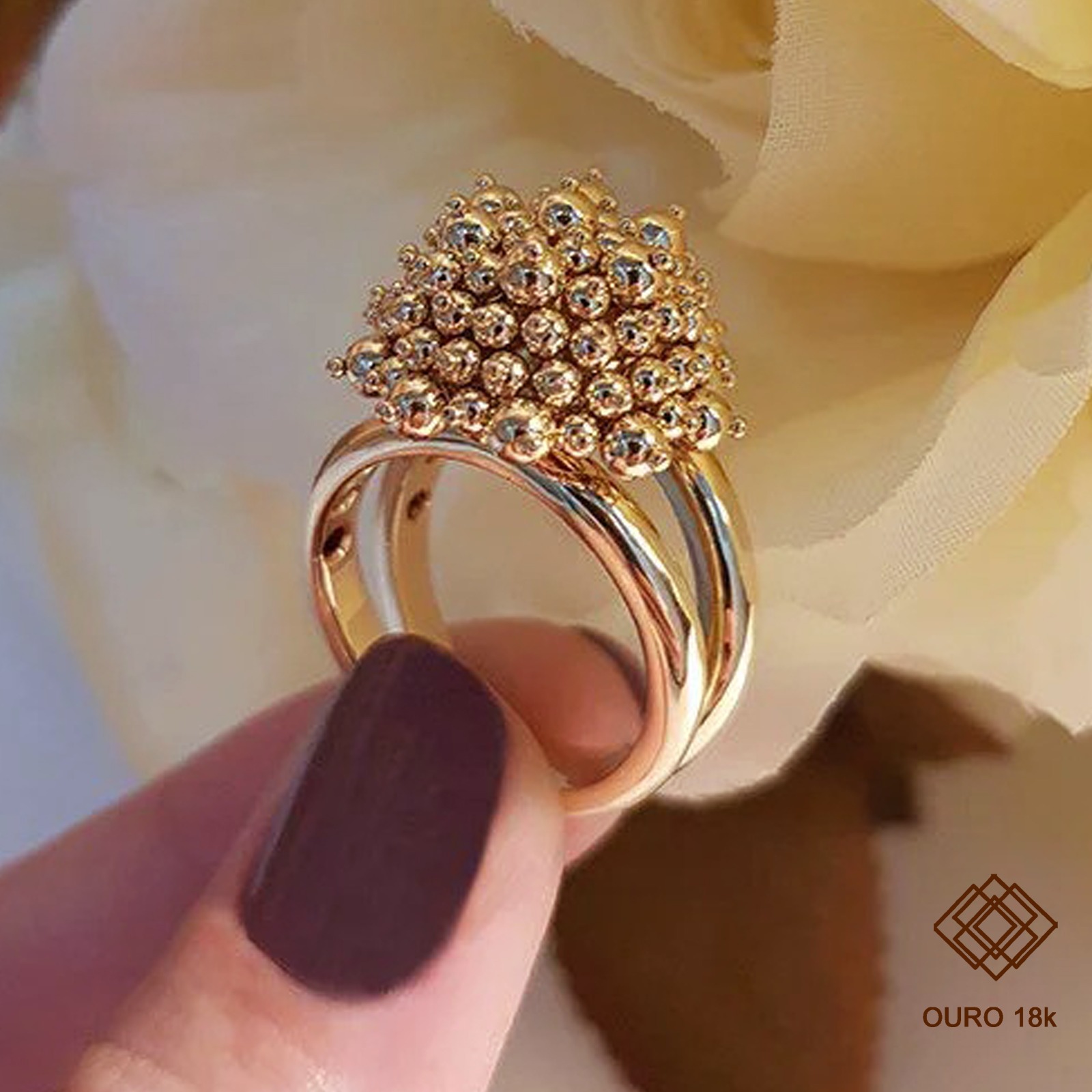 O anel para te acompanhar em todos os momentos. Além de todo o conforto e resistência de uma joia em ouro 18k, temos a junção ao design chuveiro, sendo uma base mais alta repleta de pequena esferas.