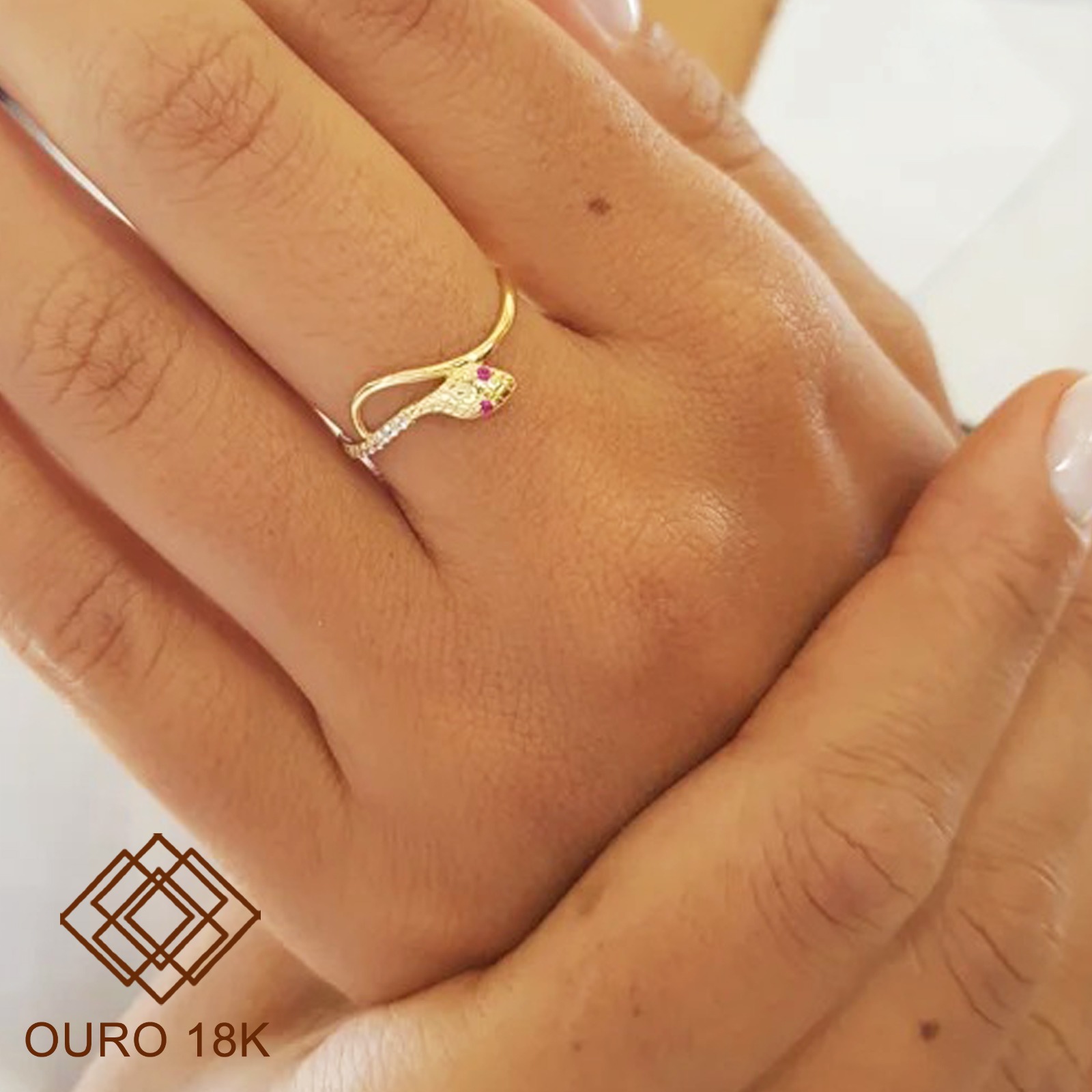 Um anel confeccionado em ouro 18k que se destaca pela sua estrutura. Elegante anel com formato cobra, confeccionado em ouro 18k e cravejado com zircônias.