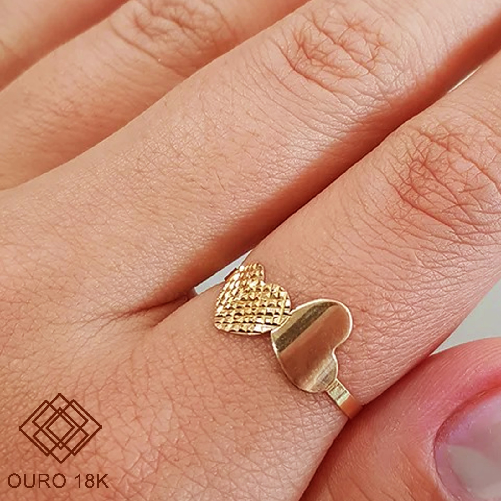 Para quem ama joias românticas, este anel se torna a escolha perfeita. O design com dois corações, confeccionado em ouro 18k, trazendo delicadeza e qualidade para as composições do seu dia a dia.