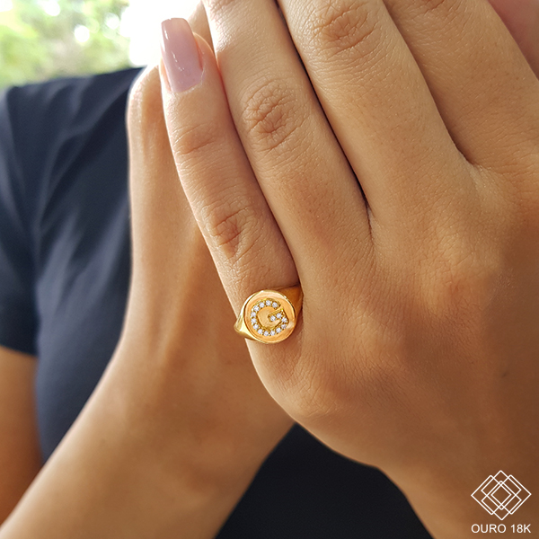 As joias de letras estão a muito tempo no universo joalheiro. A letra inicial do nome traz uma ligação de proximidade e demonstração de personalidade. Como este anel para dedinho com a letra G, confeccionado todo em ouro 18k e cravejado com zircônias.