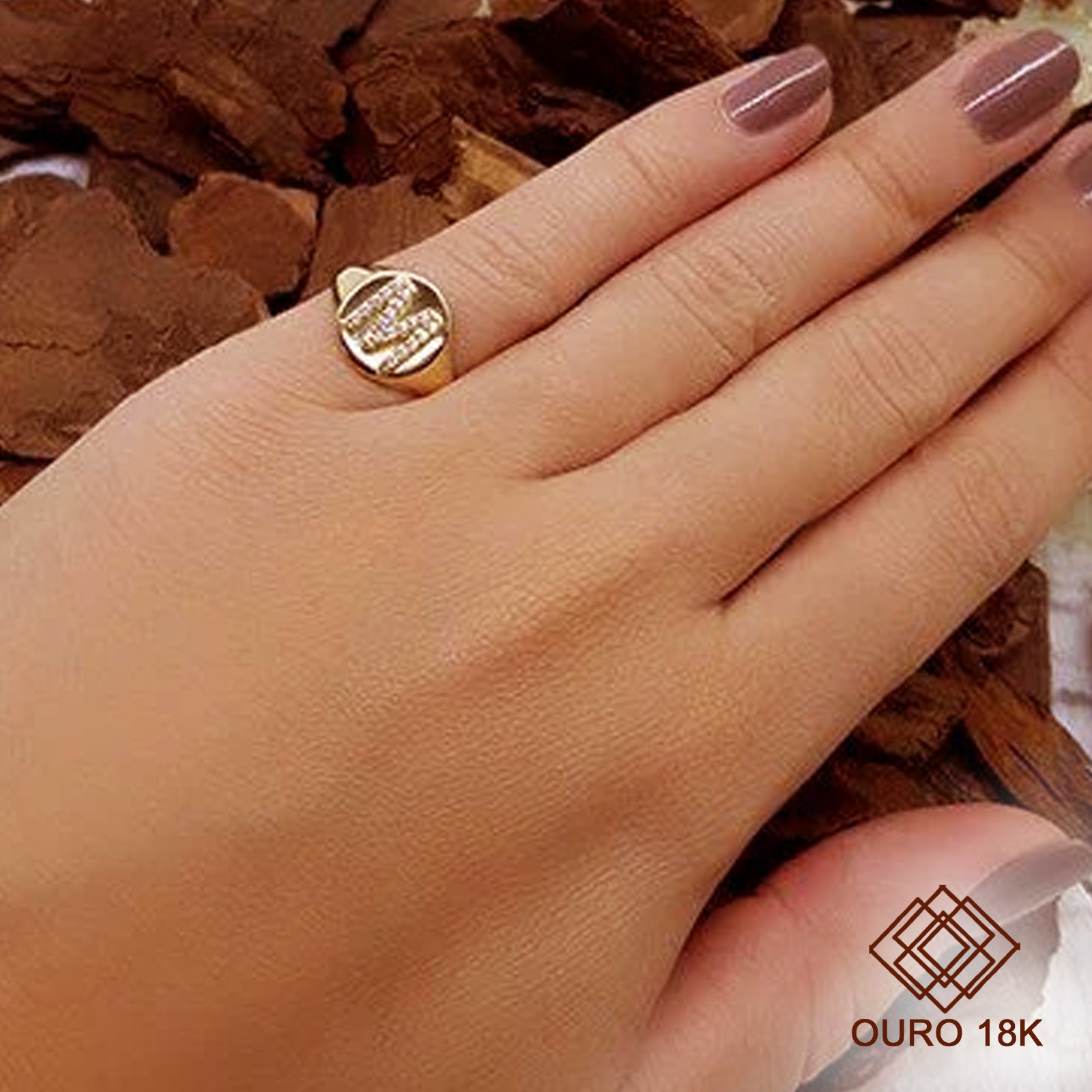 Opção elegante para ser usada no dedinho, confeccionada toda em ouro 18k e cravejada com zircônia.
