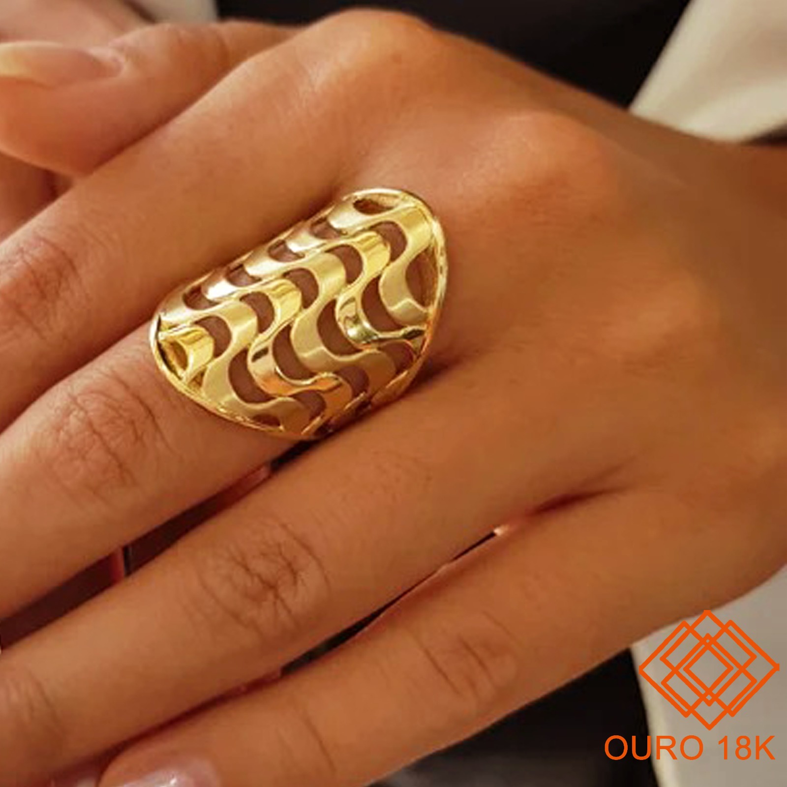Anel confeccionado em ouro 18k que traz um design fluido, moderno e marcante. As curvas onduladas se alternam em texturas, criando um efeito visual de brilho e leveza. A estrutura ampla e vazada proporciona conforto e elegância, ideal para quem busca uma peça imponente sem perder a delicadeza.