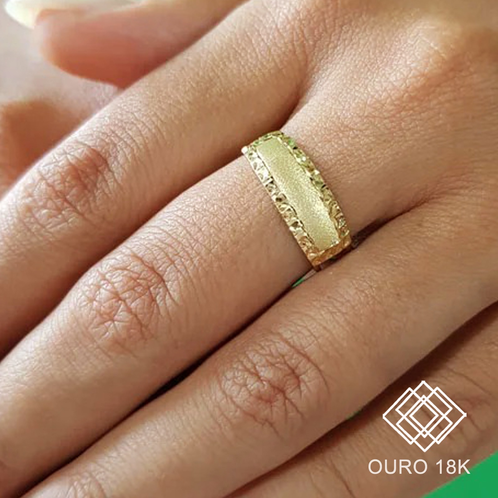 O anel perfeito para quem ama joias elegantes. Toda a qualidade do ouro 18k em um design estamparia, trazendo conforto e resistência. Invista em uma joia toda em ouro 18k para te acompanhar em todos os momentos, destacando em qualquer composição.