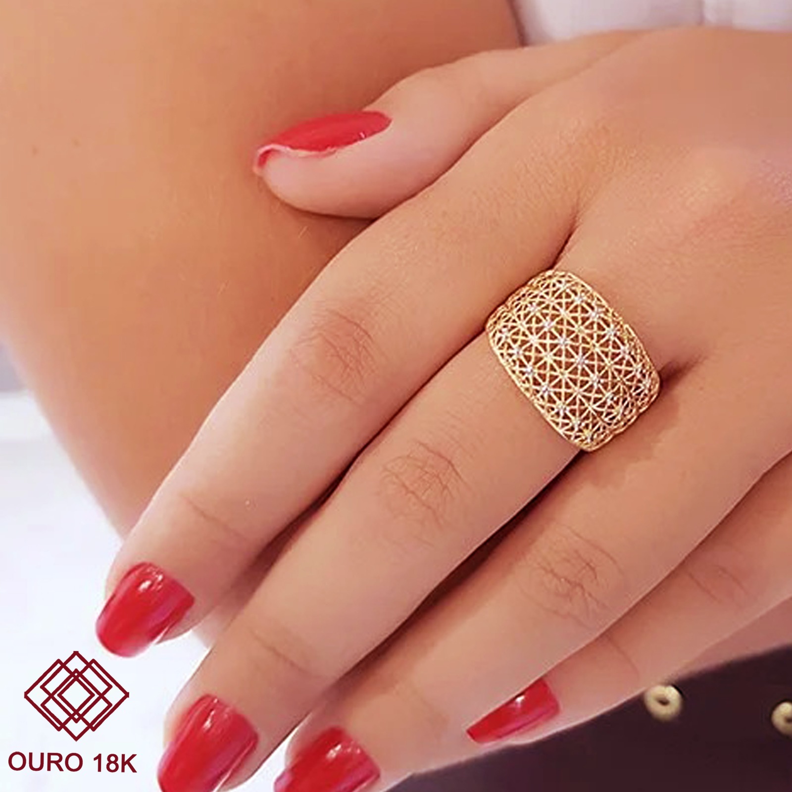 Como este anel, em sua trama rendada de fios de ouro se torna essa joia única e especial. Destacando sua elegância em qualquer composição. Invista neste modelo!