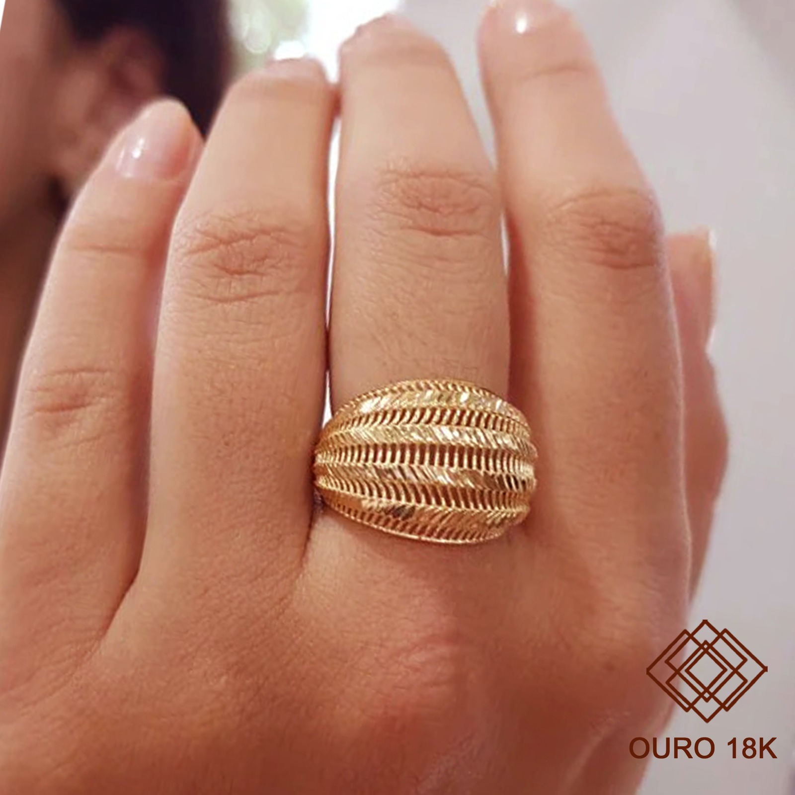Este anel, em trama rendada de fios de ouro, será uma joia única e especial de sua coleção. Destacando sua elegância em qualquer composição. Invista neste modelo!
