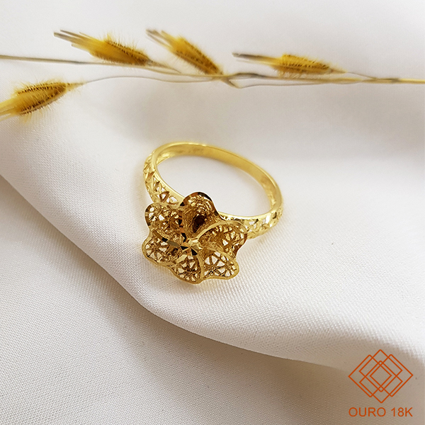 Como este anel, em trama rendada de fios de ouro combinado com a beleza do formato flor. Destacando sua elegância em qualquer composição. Invista neste modelo!