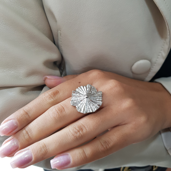 O anel regulável em prata 925 é uma joia de design marcante e artístico, inspirado nas formas orgânicas da natureza. Seu topo texturizado cria um efeito visual sofisticado, com relevo delicado que reflete a luz de maneira elegante e diferenciada.