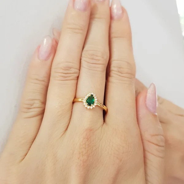 Sofisticação e durabilidade, ideal para marcar conquistas com elegância. Este anel é fabricado em ouro 18k, garantindo resistência e brilho incomparável por longos anos. Seu design delicado inclui uma pedra em formato gota rodeada por pedras menores que ressaltam o luxo da peça, sem incluir emblema, proporcionando um visual clássico e versátil.
