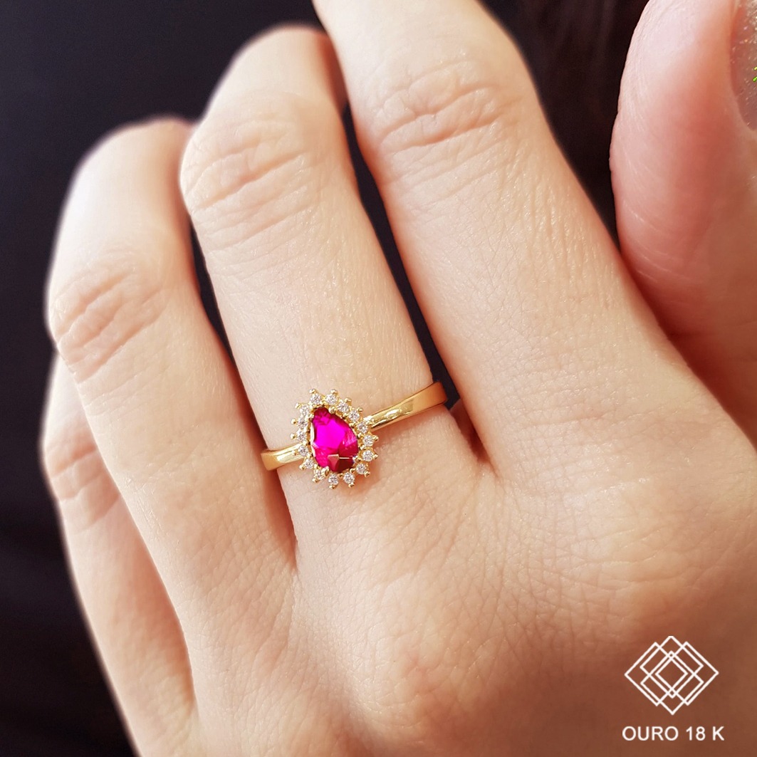 Sofisticação e durabilidade, ideal para marcar conquistas com elegância. Este anel é fabricado em ouro 18k, garantindo resistência e brilho incomparável por longos anos. Seu design delicado inclui uma pedra em formato gota rodeada por pedras menores que ressaltam o luxo da peça, sem incluir emblema, proporcionando um visual clássico e versátil.
