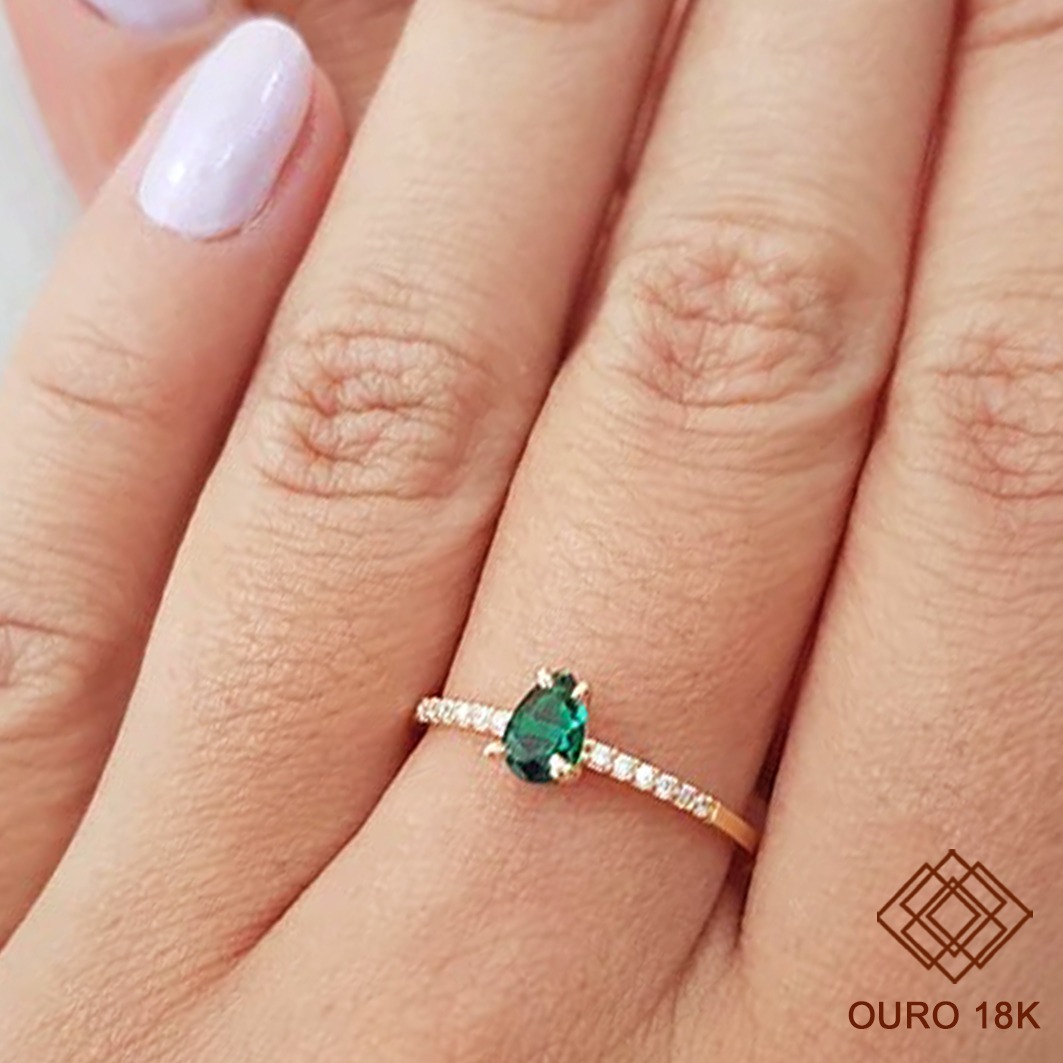 Sofisticação e durabilidade, ideal para marcar conquistas com elegância. Este anel é fabricado em ouro 18k, garantindo resistência e brilho incomparável por longos anos. Seu design delicado inclui uma pedra em formato gota e pedras menores na lateral do aro que ressaltam o luxo da peça, sem incluir emblema, proporcionando um visual clássico e versátil.
