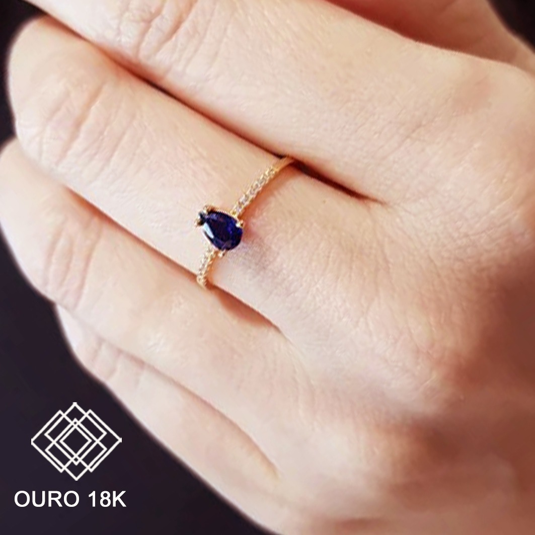 Sofisticação e durabilidade, ideal para marcar conquistas com elegância. Este anel é fabricado em ouro 18k, garantindo resistência e brilho incomparável por longos anos. Seu design delicado inclui uma pedra em formato gota e pedras menores na lateral do aro que ressaltam o luxo da peça, sem incluir emblema, proporcionando um visual clássico e versátil.
