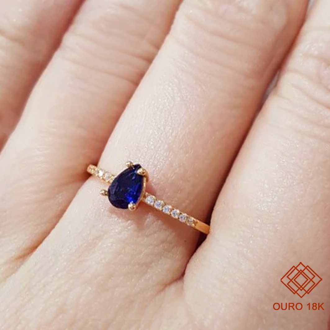Sofisticação e durabilidade, ideal para marcar conquistas com elegância. Este anel é fabricado em ouro 18k, garantindo resistência e brilho incomparável por longos anos. Seu design delicado inclui uma pedra em formato gota e pedras menores na lateral do aro que ressaltam o luxo da peça, sem incluir emblema, proporcionando um visual clássico e versátil.