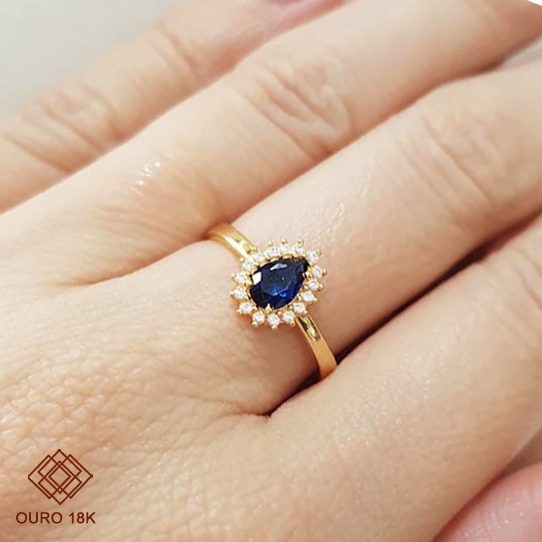 Sofisticação e durabilidade, ideal para marcar conquistas com elegância. Este anel é fabricado em ouro 18k, garantindo resistência e brilho incomparável por longos anos. Seu design delicado inclui uma pedra em formato gota rodeada por pedras menores que ressaltam o luxo da peça, sem incluir emblema, proporcionando um visual clássico e versátil.