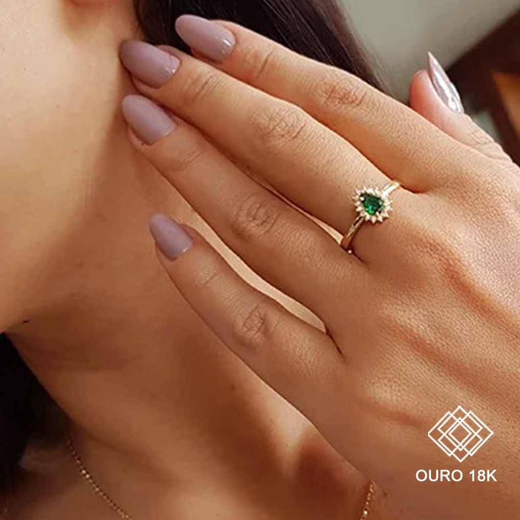 Sofisticação e durabilidade, ideal para marcar conquistas com elegância. Este anel é fabricado em ouro 18k, garantindo resistência e brilho incomparável por longos anos. Seu design delicado inclui uma pedra em formato gota rodeada por pedras menores que ressaltam o luxo da peça, sem incluir emblema, proporcionando um visual clássico e versátil.