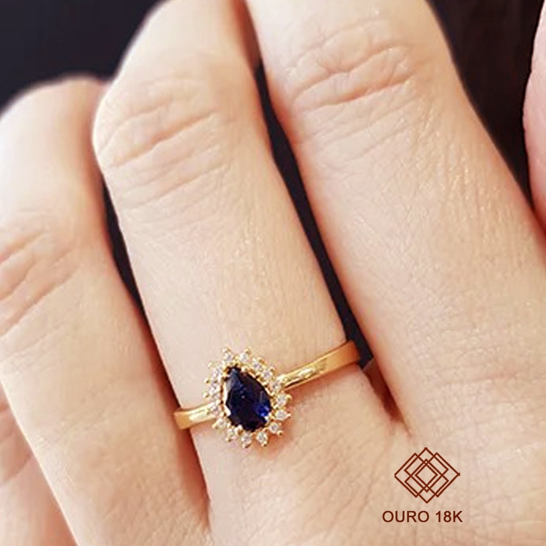 Sofisticação e durabilidade, ideal para marcar conquistas com elegância. Este anel é fabricado em ouro 18k, garantindo resistência e brilho incomparável por longos anos. Seu design delicado inclui uma pedra em formato gota rodeada por pedras menores que ressaltam o luxo da peça, sem incluir emblema, proporcionando um visual clássico e versátil.