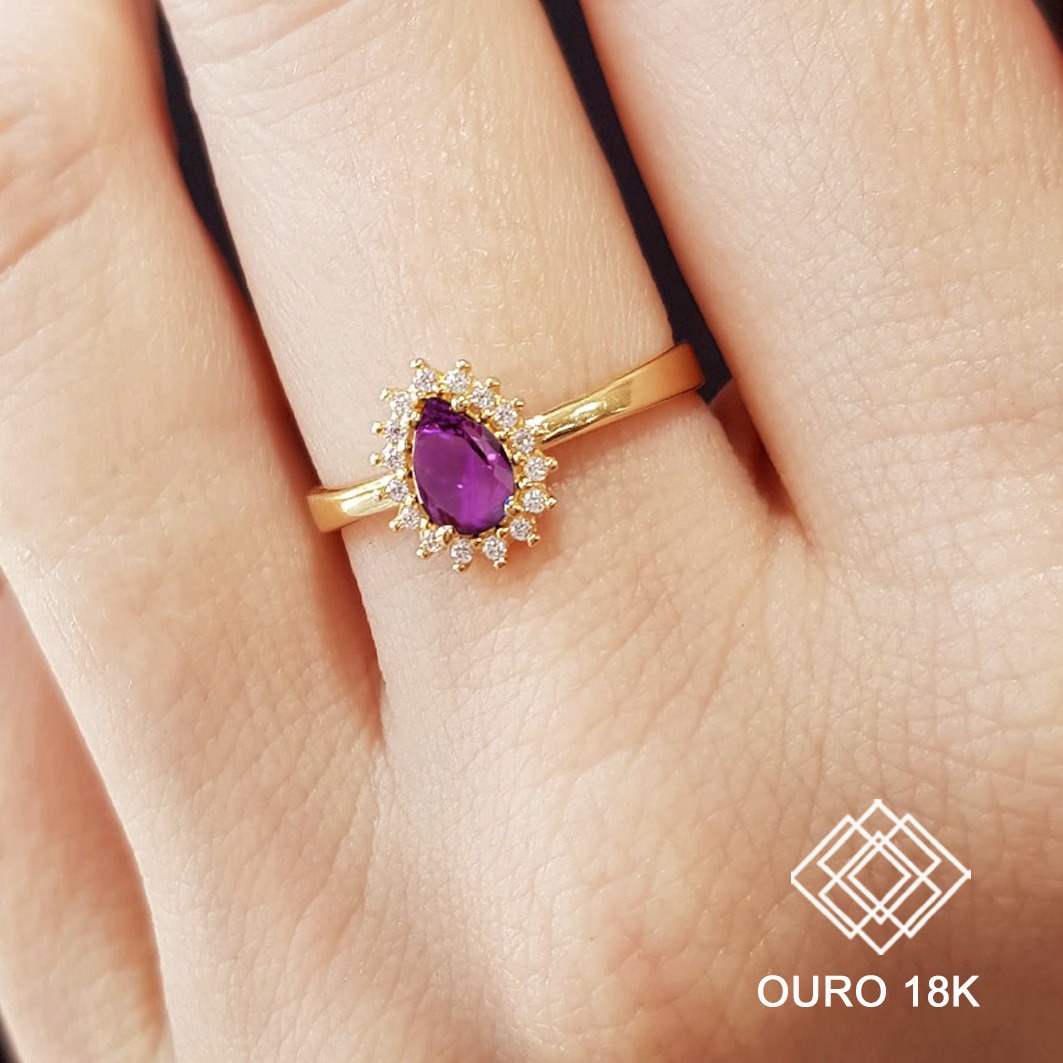 Sofisticação e durabilidade, ideal para marcar conquistas com elegância. Este anel é fabricado em ouro 18k, garantindo resistência e brilho incomparável por longos anos. Seu design delicado inclui uma pedra em formato gota rodeada por pedras menores que ressaltam o luxo da peça, sem incluir emblema, proporcionando um visual clássico e versátil.