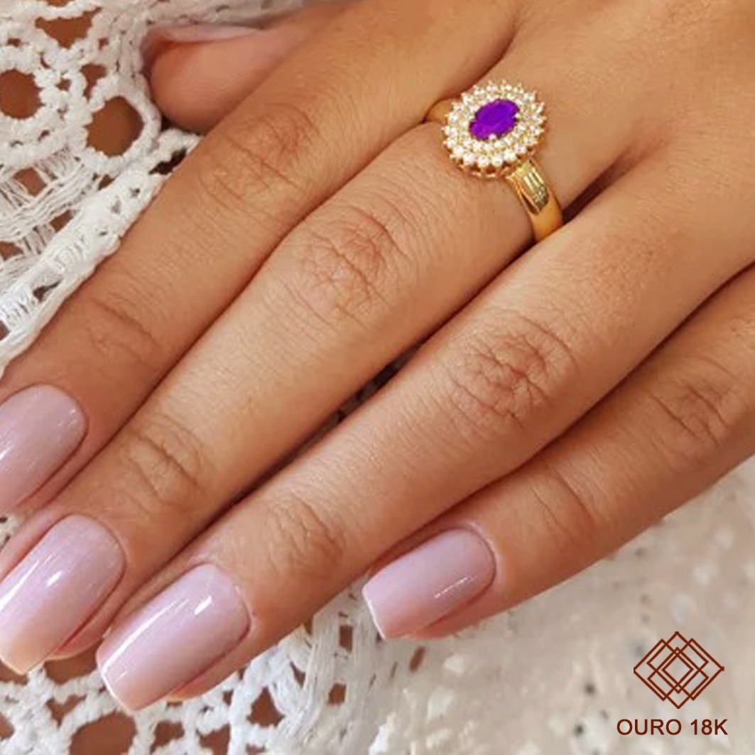 Confeccionado em ouro 18k, o anel oferece brilho duradouro, resistência e acabamento impecável. O contraste entre o tom intenso da pedra central e o brilho das zircônias transmite imponência e elegância, tornando-o uma escolha perfeita para eternizar momentos marcantes.