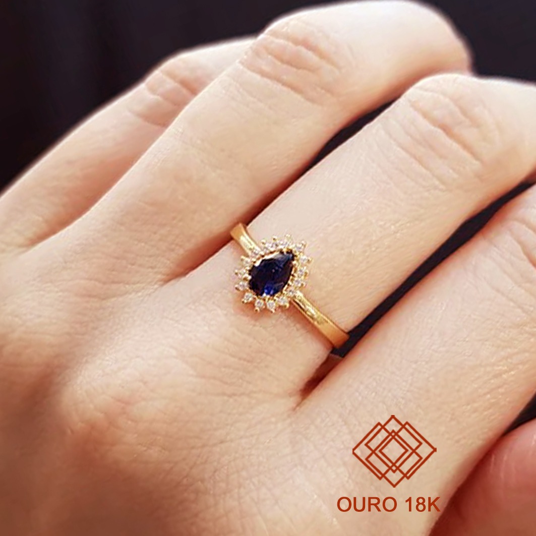 Sofisticação e durabilidade, ideal para marcar conquistas com elegância. Este anel é fabricado em ouro 18k, garantindo resistência e brilho incomparável por longos anos. Seu design delicado inclui uma pedra em formato gota rodeada por pedras menores que ressaltam o luxo da peça, sem incluir emblema, proporcionando um visual clássico e versátil.