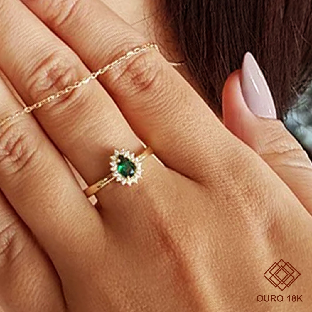 Sofisticação e durabilidade, ideal para marcar conquistas com elegância. Este anel é fabricado em ouro 18k, garantindo resistência e brilho incomparável por longos anos. Seu design delicado inclui uma pedra em formato gota rodeada por pedras menores que ressaltam o luxo da peça, sem incluir emblema, proporcionando um visual clássico e versátil.