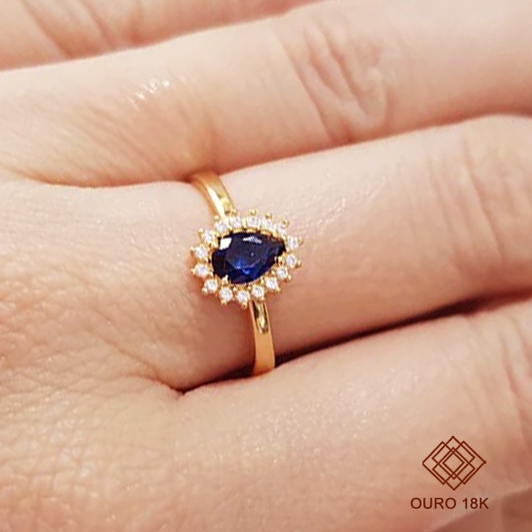 Sofisticação e durabilidade, ideal para marcar conquistas com elegância. Este anel é fabricado em ouro 18k, garantindo resistência e brilho incomparável por longos anos. Seu design delicado inclui uma pedra em formato gota rodeada por pedras menores que ressaltam o luxo da peça, sem incluir emblema, proporcionando um visual clássico e versátil.