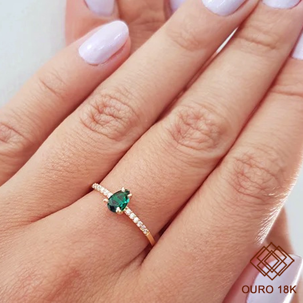 Sofisticação e durabilidade, ideal para marcar conquistas com elegância. Este anel é fabricado em ouro 18k, garantindo resistência e brilho incomparável por longos anos. Seu design delicado inclui uma pedra em formato gota e pedras menores na lateral do aro que ressaltam o luxo da peça, sem incluir emblema, proporcionando um visual clássico e versátil.