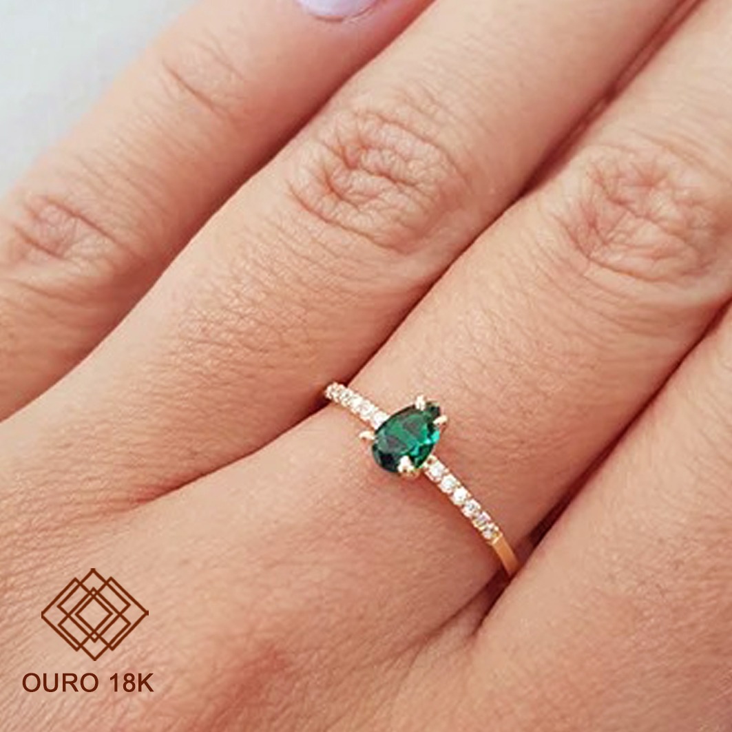 Sofisticação e durabilidade, ideal para marcar conquistas com elegância. Este anel é fabricado em ouro 18k, garantindo resistência e brilho incomparável por longos anos. Seu design delicado inclui uma pedra em formato gota e pedras menores na lateral do aro que ressaltam o luxo da peça, sem incluir emblema, proporcionando um visual clássico e versátil.