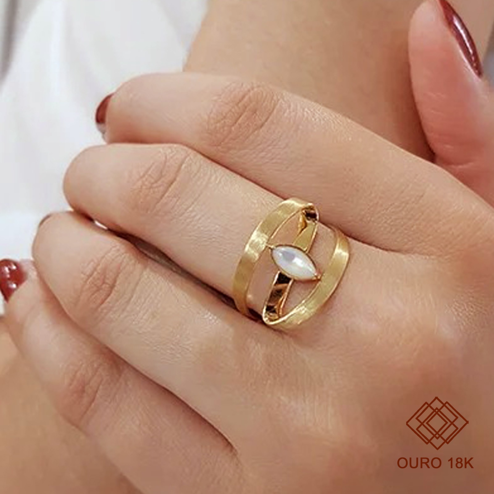 Este anel é confeccionado em ouro 18k e cravejado com madrepérola.