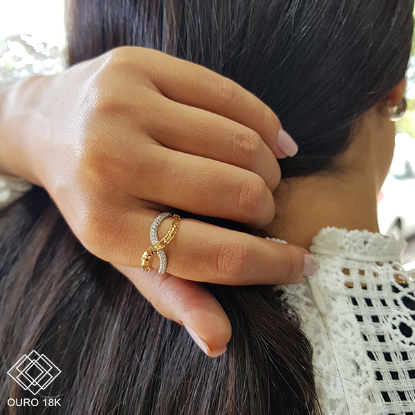 Confeccionado em ouro 18k, o anel oferece durabilidade, conforto e um acabamento impecável. A combinação entre o tom dourado do ouro e o brilho prateado do ródio branco cria um contraste moderno e elegante, ideal para compor produções versáteis, do uso diário a ocasiões especiais.