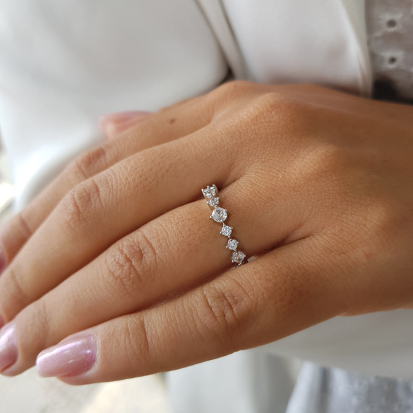 O anel em prata 925 com zircônias apresenta um design delicado e contemporâneo, com pedras dispostas em sequência que criam um efeito de brilho contínuo e sofisticado. O contraste entre os diferentes formatos das zircônias adiciona modernidade e leveza à peça, tornando-a elegante e versátil.