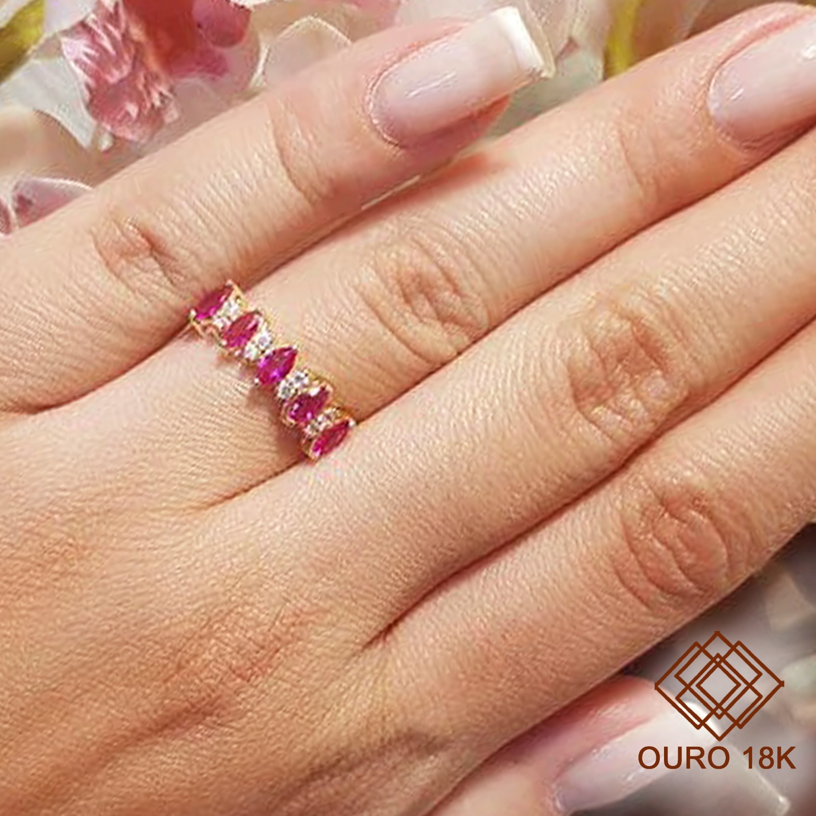O anel perfeito para quem ama joias clássicas e elegantes. Toda a qualidade do ouro 18k em um design navete, cravejado com zircônias na cor branca e vermelha, resultando em elegância, conforto e resistência. Invista em uma joia toda em ouro 18k para te acompanhar em todos os momentos, destacando em qualquer composição.