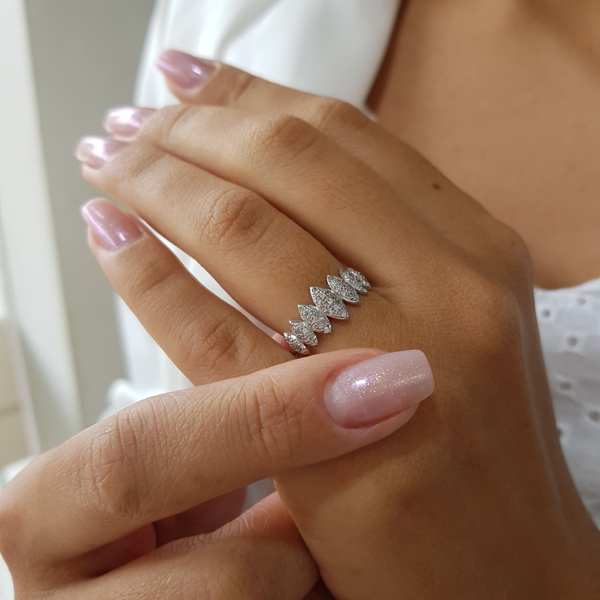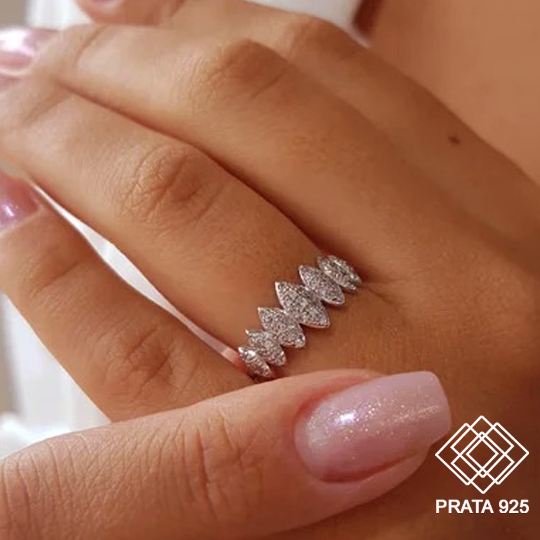 O anel em prata 925 com zircônias apresenta um design elegante e contemporâneo, composto por delicadas formas alongadas que criam um efeito visual sofisticado e harmonioso. As zircônias proporcionam brilho intenso e refinado, destacando a peça com luminosidade marcante.