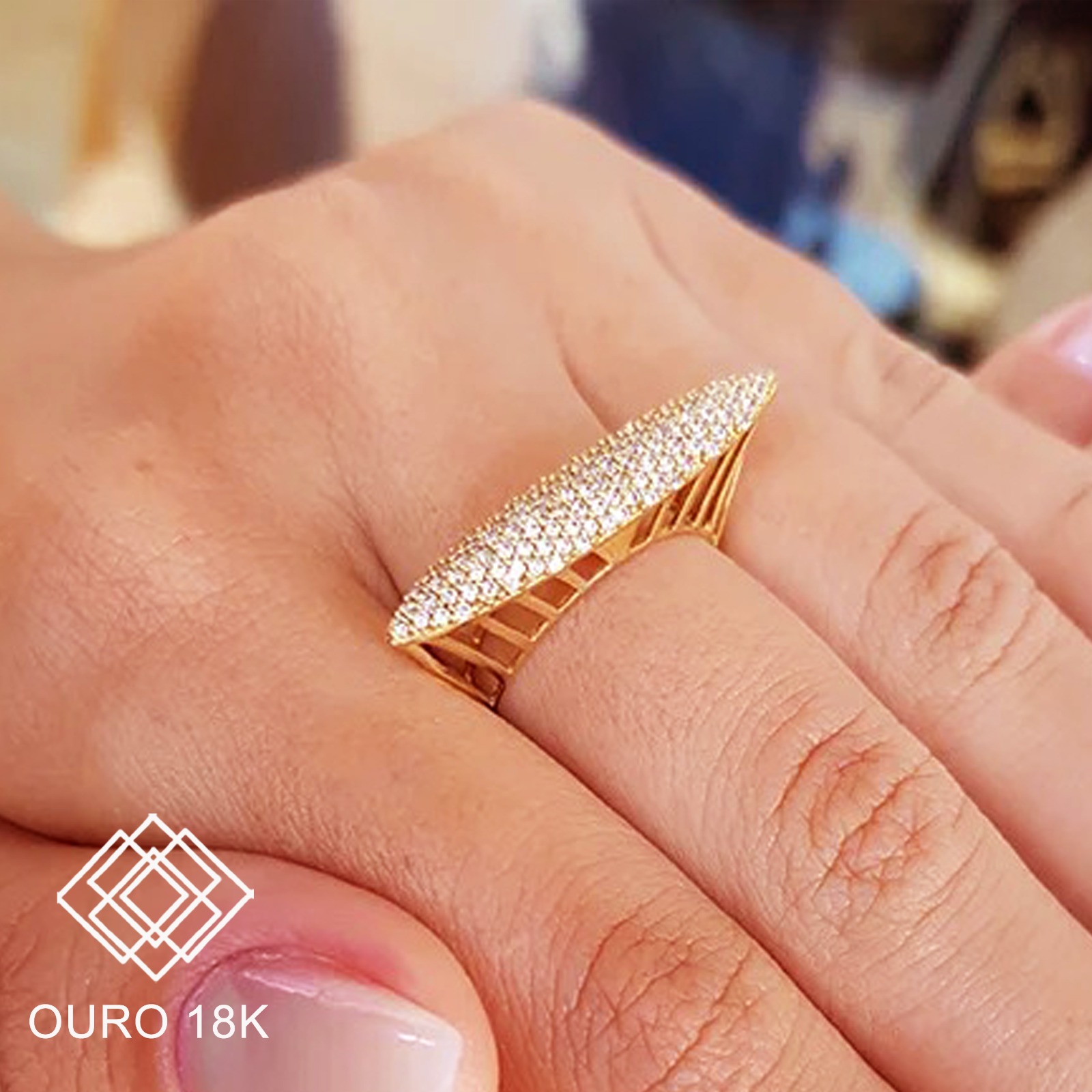 Um anel confeccionado em ouro 18k que se destaca pela sua estrutura. Os modelos pavê trazem inovação e textura às suas produções. Como é o caso deste anel, que proporciona destaque por apresentar uma base alta e cravação de zircônias.