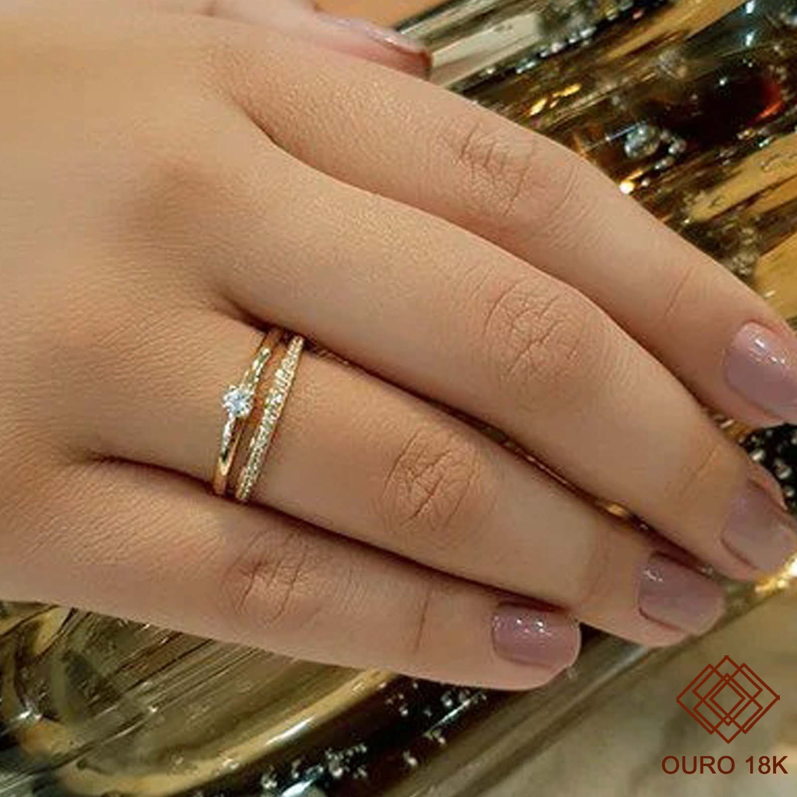 O anel perfeito para quem ama joias elegantes. Toda a qualidade do ouro 18k em um design duplo, sendo um formato aparador e um solitário, ambos cravejados com zircônias.