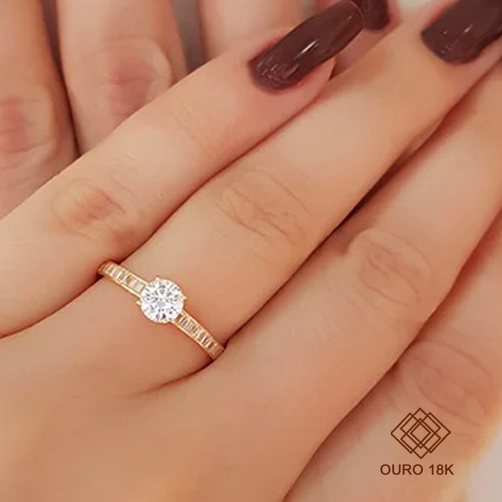 Neste modelo, confeccionado em ouro 18k, temos a presença de pedras na lateral do aro e uma pedra central. O solitário é tradicionalmente a escolha perfeita para eternizar os mais belos momentos.