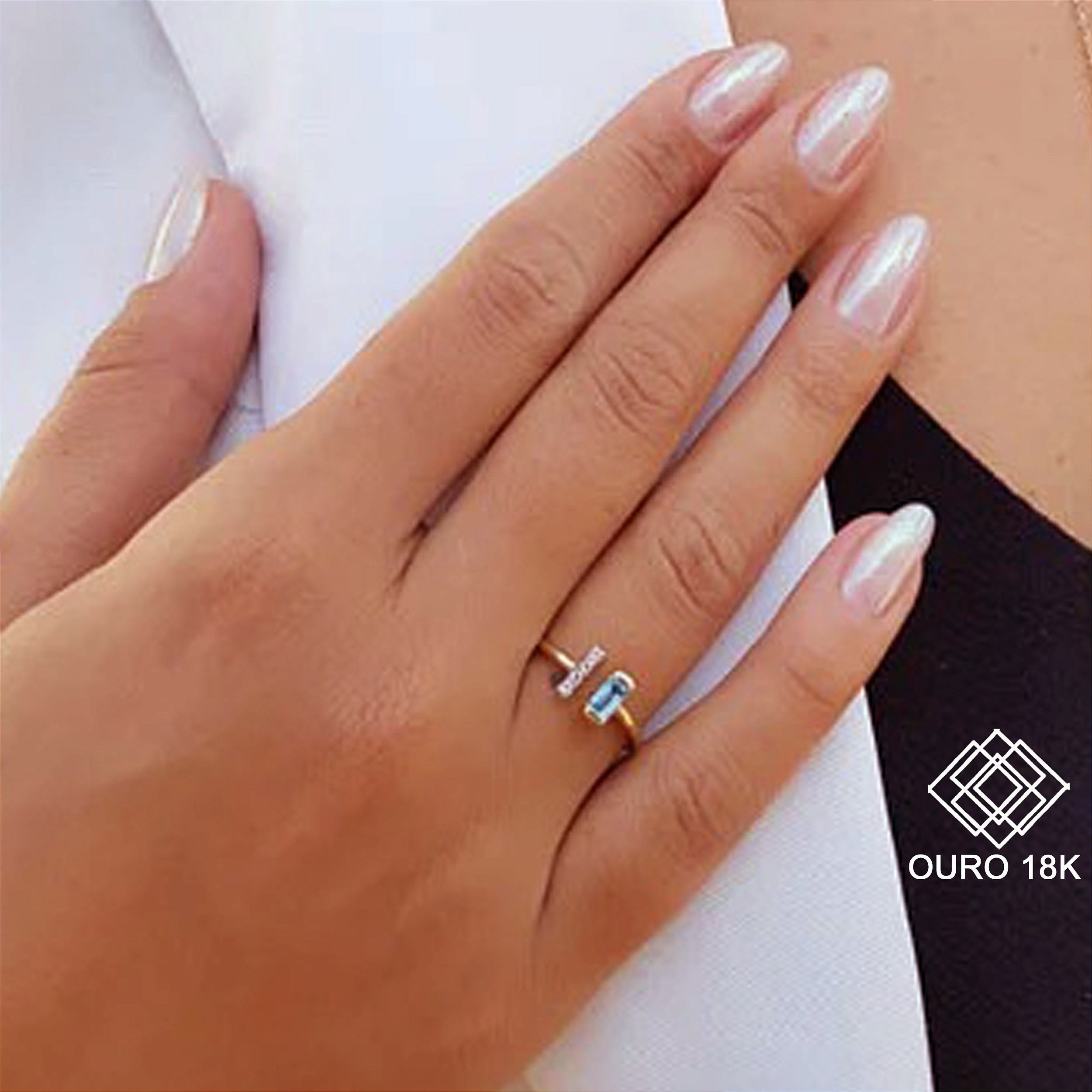 Este anel é deslumbrante, adornado com topázios nas cores branco e azul. Uma peça que combina a nobreza do ouro 18k com a beleza hipnotizante dos topázios.