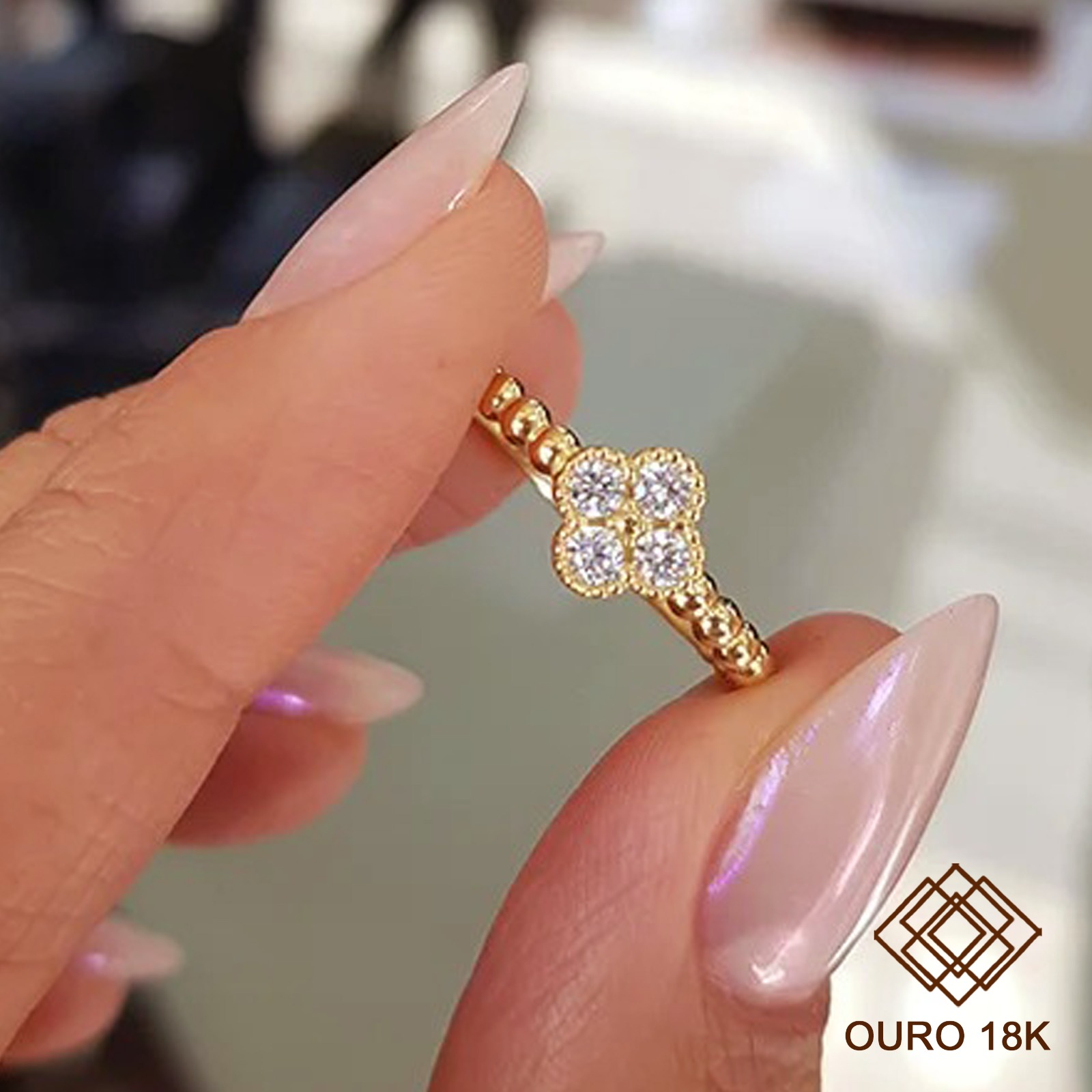 Um anel todo confeccionado em ouro 18k que confere elegância e qualidade à suas produções. Um design delicado e elegante, com um trevo da sorte.