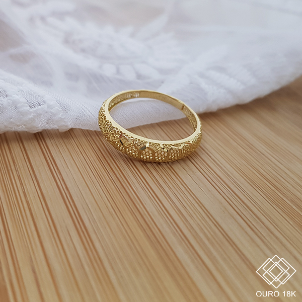 Um anel especial para você, que busca peças modernas e inovadoras! Este anel é confeccionado em ouro 18k. Destaque para o trabalho de recortes que forma um elo com círculos em sua superfície o trabalho simula o forma de uma colmeia, o que traz elegância e inovação para a peça!