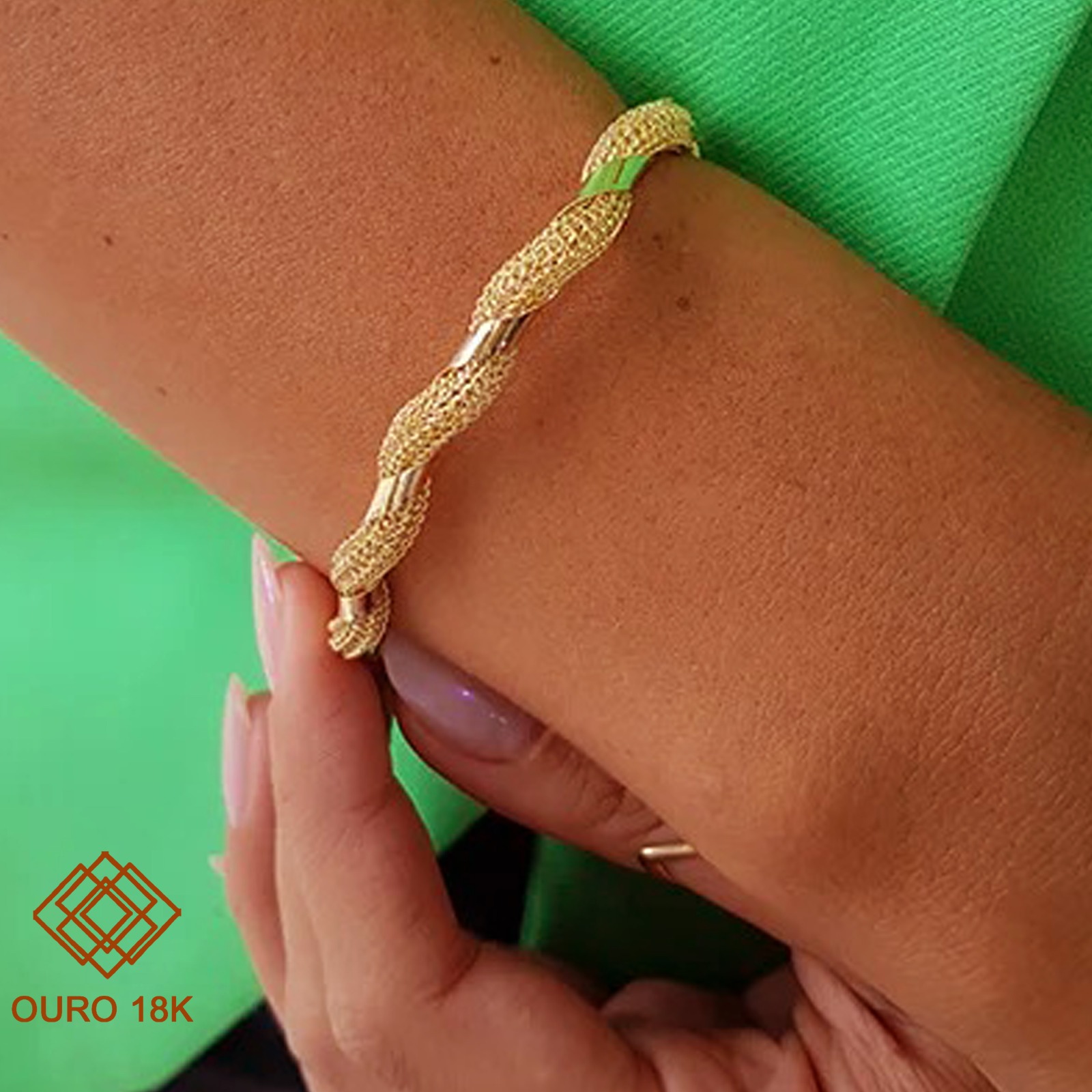 Este bracelete traz beleza e elegância, confeccionado todo em ouro 18k, para seu conforto e segurança. Uma estrutura moderna que apresenta o elegante acabamento torcido em composição com a trama filigrana. Além de detalhes deslumbrantes apresenta estrutura maleável, não tendo a característica rígida normalmente presente no bracelete.
