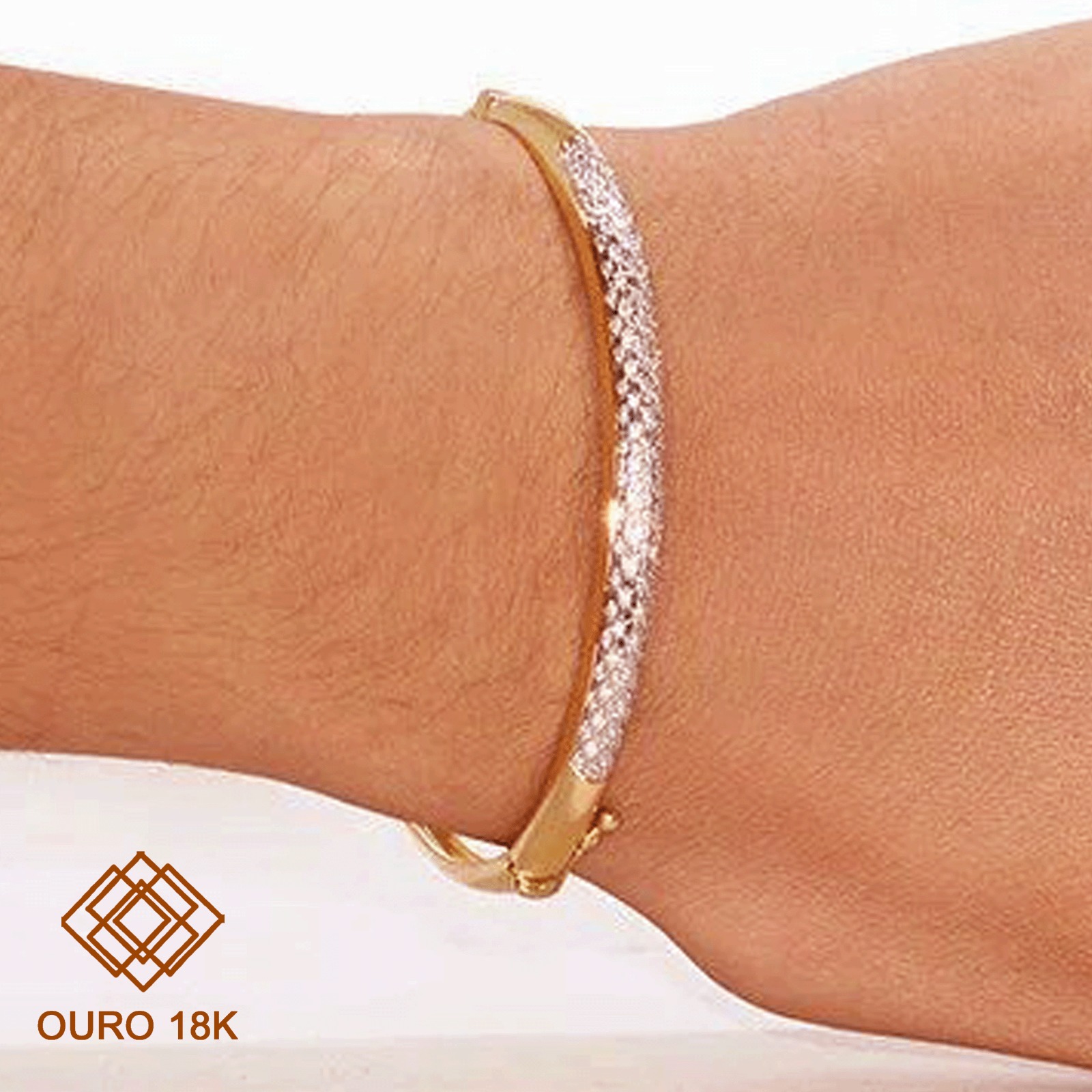 Este design se destaca por possuir uma estrutura reforçada e cravejada com zircônias. Confeccionado em ouro 18k, garante a beleza e o conforto para seu dia a dia.