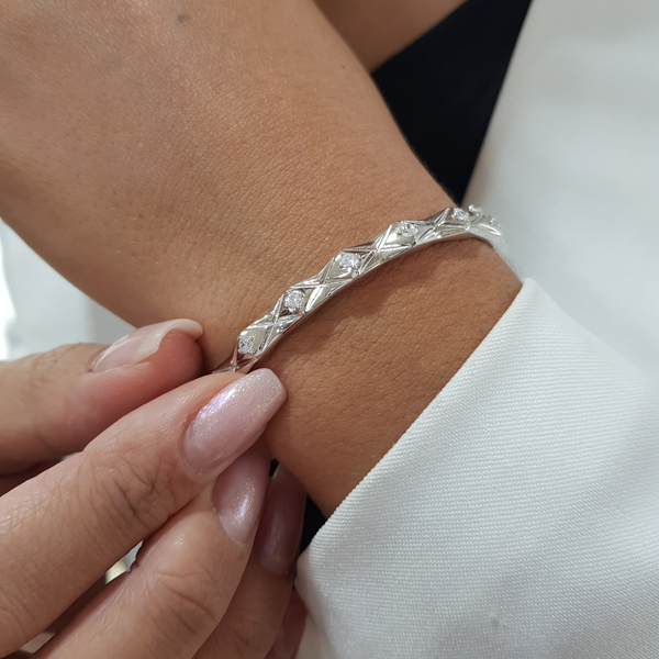 O bracelete em prata 925 é uma joia delicada e sofisticada, perfeita para quem aprecia detalhes refinados. Seu design com linhas entrelaçadas cria um efeito visual elegante, enquanto as zircônias distribuídas ao longo da peça adicionam pontos de brilho sutis e harmoniosos.