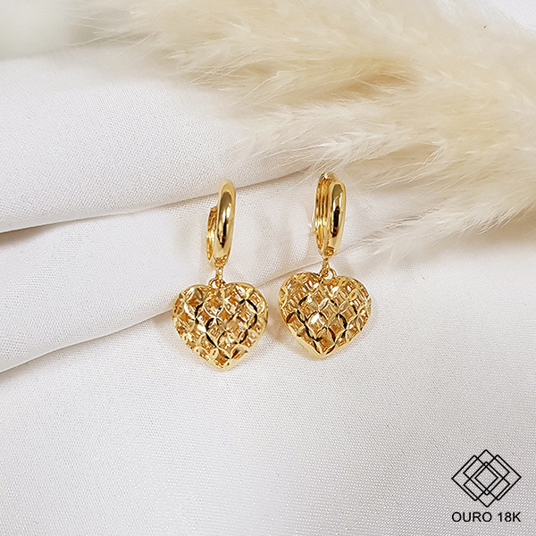O brinco argola com pingente de coração é confeccionado em ouro 18k. Seu design diamantado confere brilho e elegância para essa peça, que valoriza diversas composições. Uma joia que encanta os olhos e chama atenção em composições casuais e sofisticadas por sua beleza.
