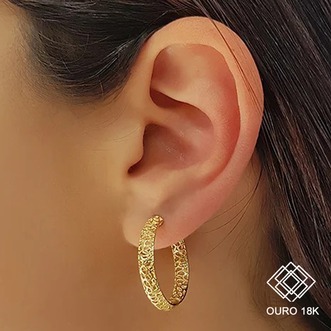Brinco confeccionado em ouro 18k. No clássico design argola,este brinco possui elegante estrutura filigrana seu design vazado traz ainda mais presença para essa joia devido ao charmoso contraste do ouro com a pele. Uma joia sofisticada e luxuosa, perfeita para valorizar suas composições e te acompanhar em todos os momentos!