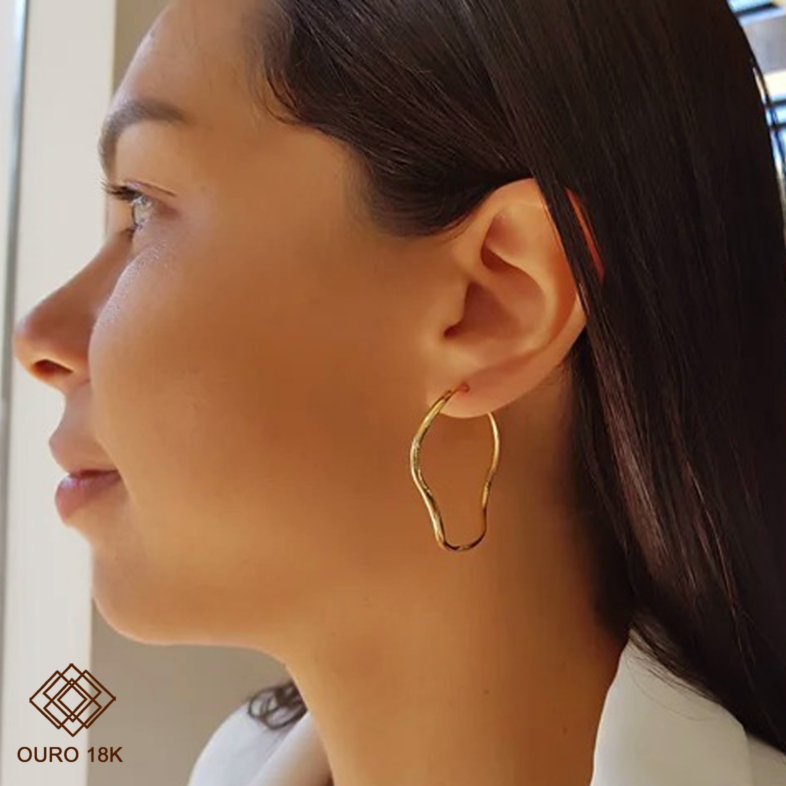Com design moderno e fluido, o brinco argola ondas é a expressão perfeita da sofisticação com um toque de originalidade. Confeccionado em ouro 18k, ele une o brilho atemporal do metal nobre a curvas suaves que remetem ao movimento das ondas, trazendo leveza e charme à peça.