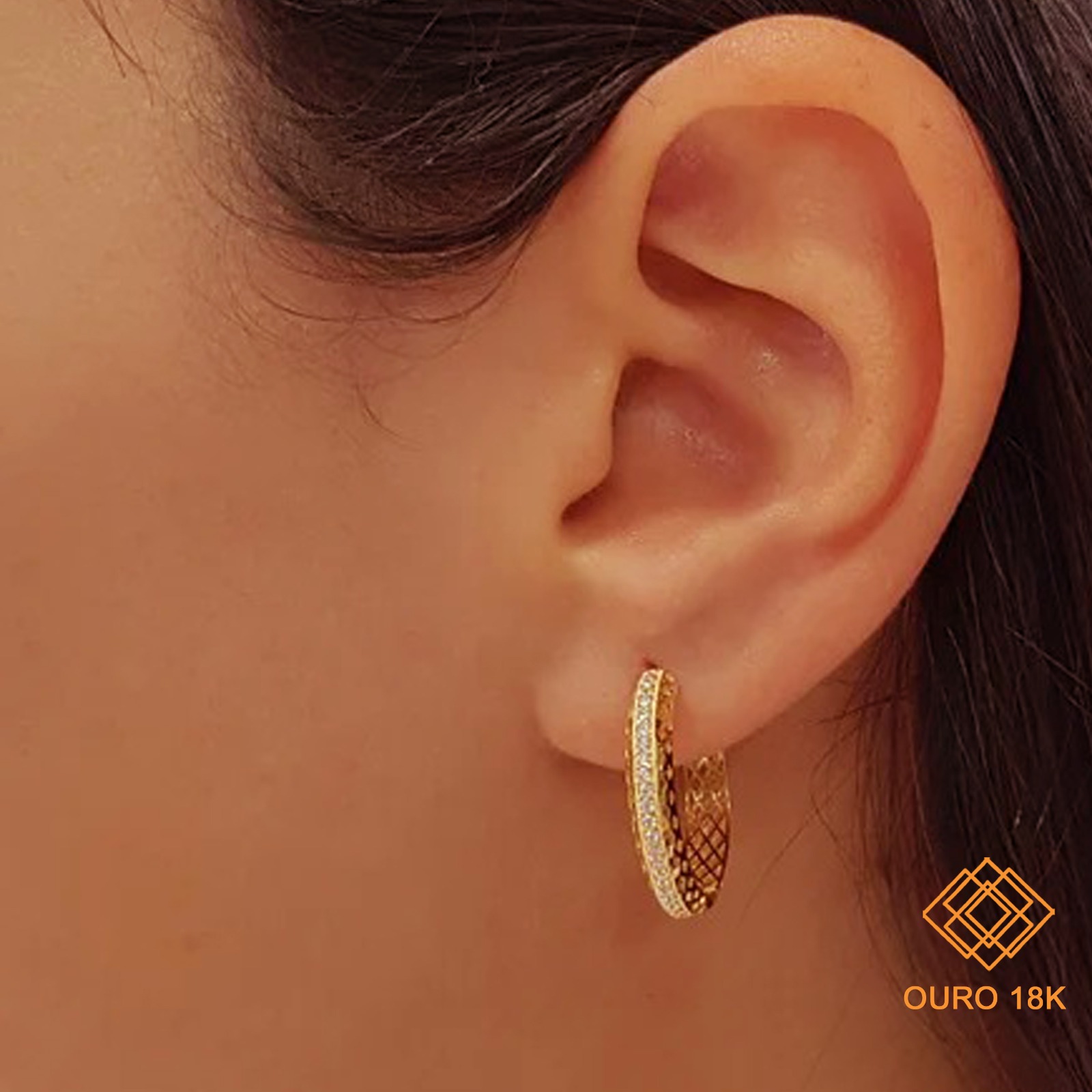 Brinco design argola, confortável e antialérgico, perfeito para te acompanhar em todas as atividades do seu dia a dia. Desfrute da qualidade do ouro 18k!