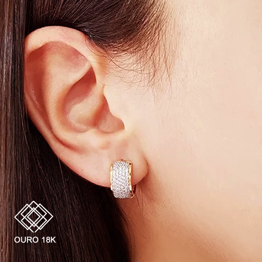 Brinco argola confeccionado em ouro 18k, confortável e antialérgico, perfeito para te acompanhar em todas atividades do seu dia a dia. Em tamanho pequeno, porém com espessura larga, cravejado com zircônias e acabamento com ródio branco para conferir mais destaque as pedras.