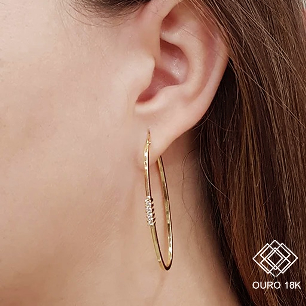 Brinco argola, confortável e antialérgico, perfeito para te acompanhar em todas atividades do seu dia a dia. Um design clássico confeccionado em ouro 18k e cravejado com zircônias. Com tamanho maior e formato oval, se torna uma peça versátil e valoriza suas composições. Garanta o seu brinco argola!