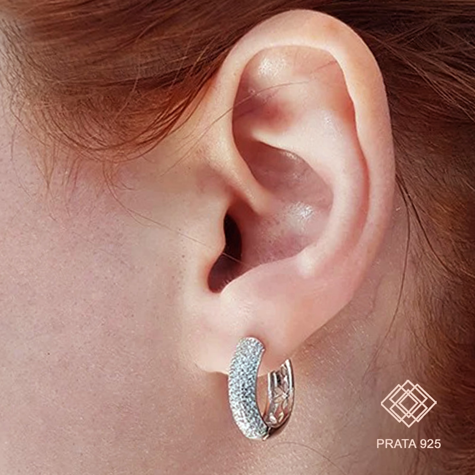 Brinco argola com elegante cravação de zircônias, confeccionado em prata 925, uma peça hipoalérgica que te garante conforto em todos os momentos